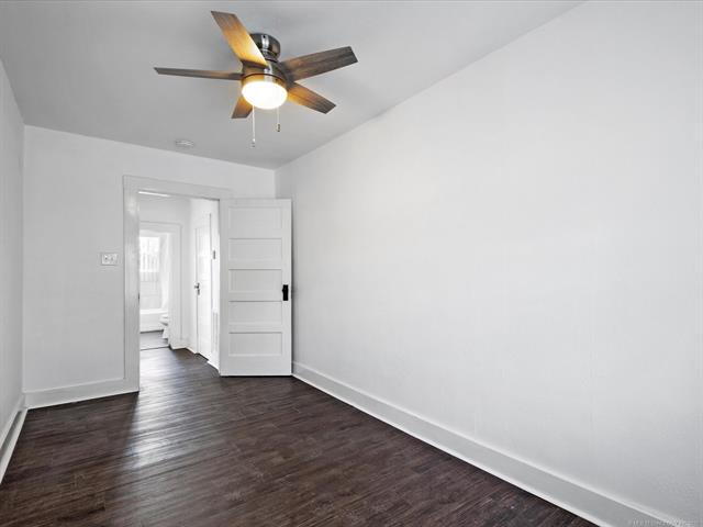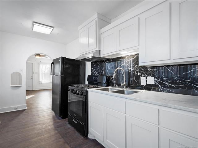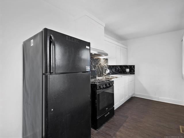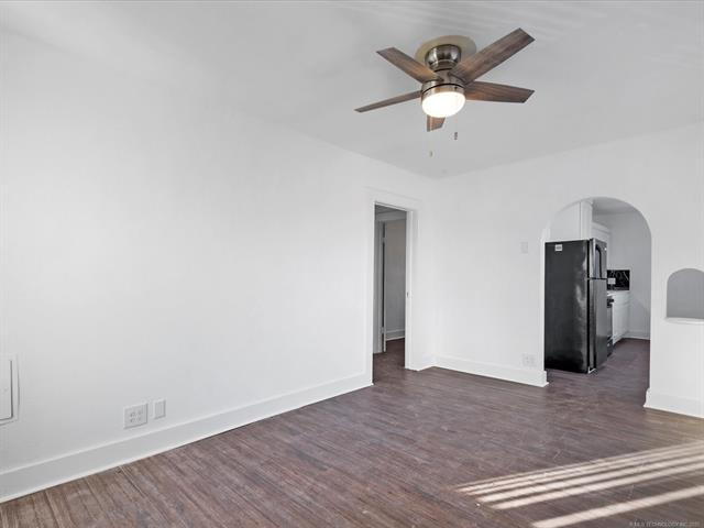 1 bed, 1 bath upstairs duplex at 111 SE Delaware Ave in Bartlesville. This unit features new flooring, fresh paint, updated kitchen cabinets with backsplash, and matching appliances. The bathroom includes a full tub/shower with tiled surround. Ceiling fans and large windows bring in plenty of natural light throughout.