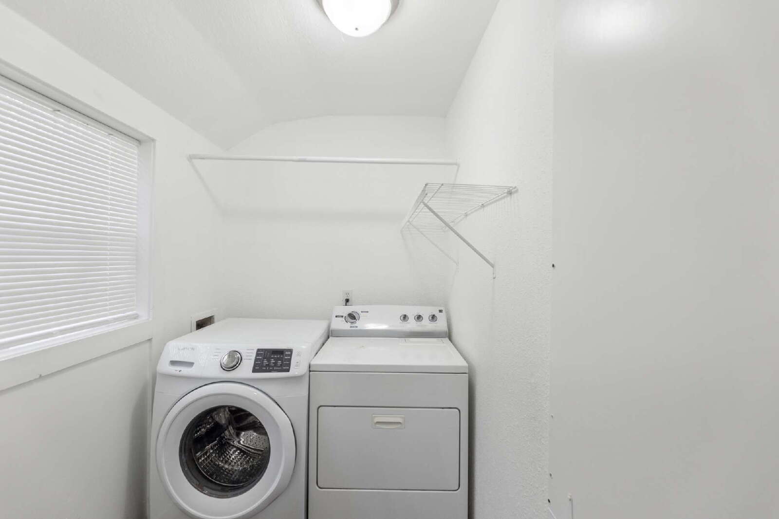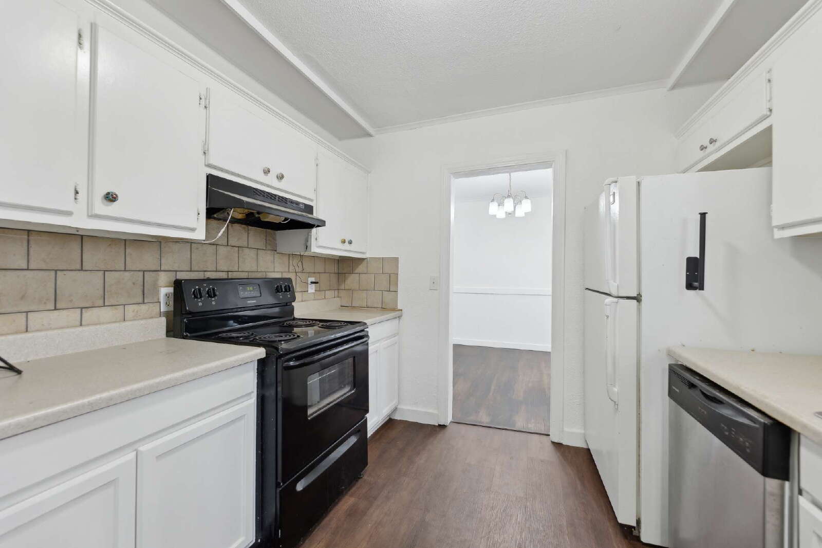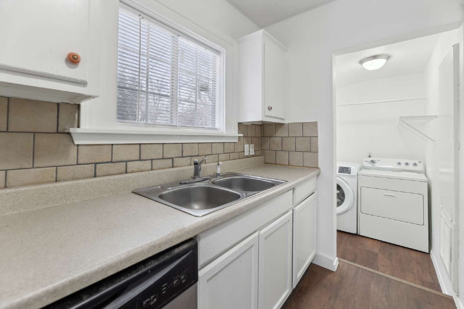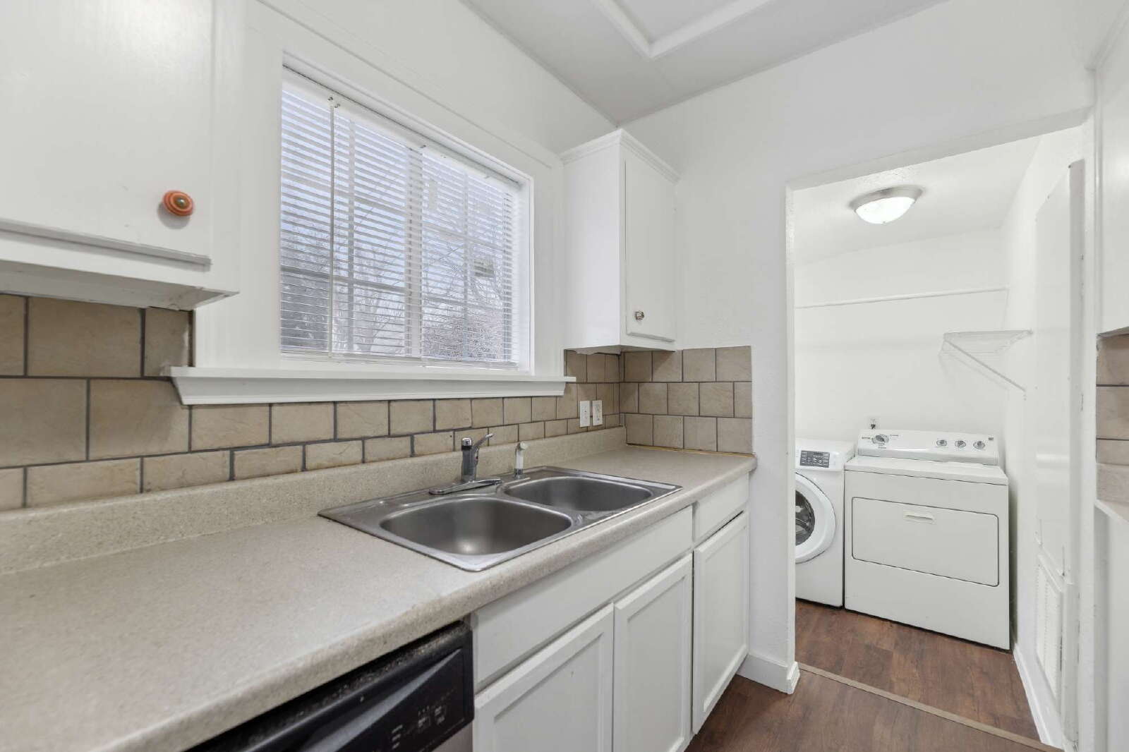 Inside, the home features a spacious living area filled with natural light that flows seamlessly into the dining room and kitchen. The kitchen offers ample cabinet space and comes equipped with a stove, dishwasher, and refrigerator. A dedicated interior laundry room includes a washer and dryer for added convenience.