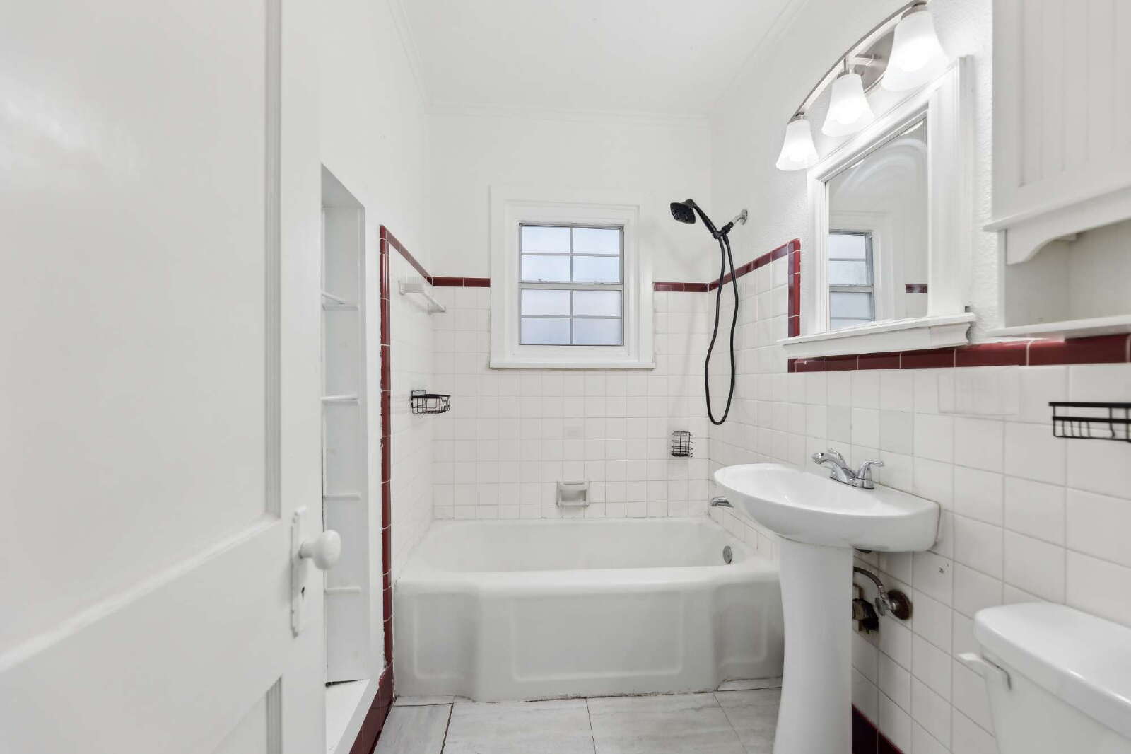The bathroom features classic tilework, a full-sized bathtub with a shower, and built-in storage for added functionality.